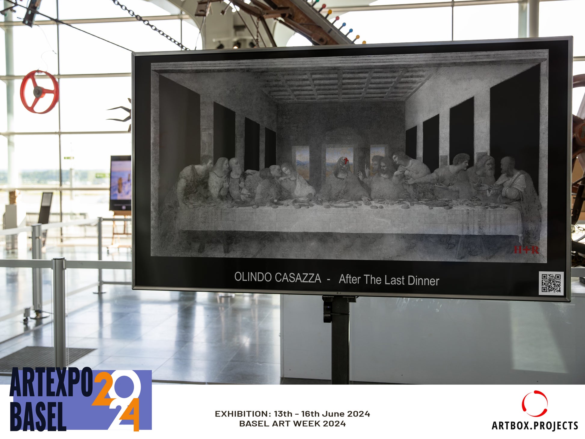 After the Last Dinner: Tribute to Leonardo Da Vinci The Last Supper (1494-1498), a reenactment in gray tones, with only the landscape in color, like three windows to heaven, and the imminent resurrection. The representation is frozen at the moment when Jesus dips a morsel of bread into the Passover meal and offers it to Judas Iscariot, saying, "What you must do, do quickly." He then states, "Truly, I say to you, one of you will betray me," and announces his arrest. The Evangelists are portrayed in groups of three, like a series of successive emotional waves, with the isolated and dominant figure of Christ at the center, who bears on his hands the stigmata of his Passion and Crucifixion shortly thereafter. John rightly emphasizes that it is the hour of darkness, the hour of the Evil One, who vents his anger against the Son of God. It is not the traitor who occupies time and space; Christ is sovereign, his freedom is sovereign, his gift is regal, his self-offering, the love that, unloved, conquers the world. addition to the Gospel episode, the work also symbolizes the institution of the Eucharist, the bread and wine offered by Jesus in his memory.